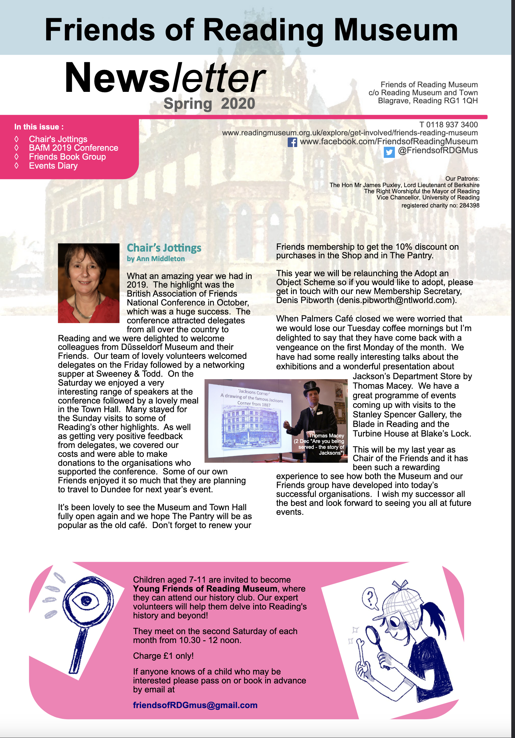 Our newsletters are published in spring and autumn. They are distributed to FoRM members by email or post and a limited number of copies are also available from Reading Museum.